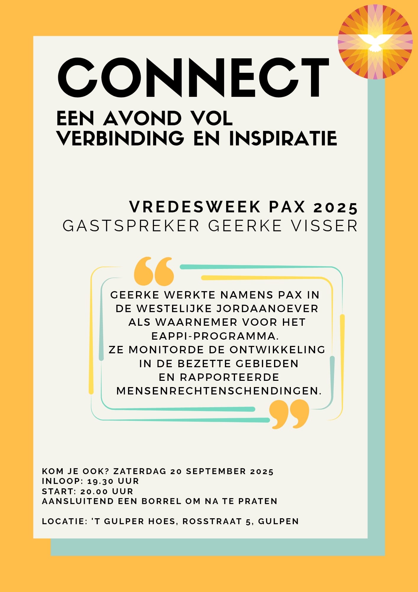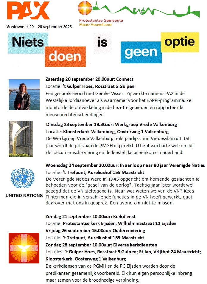![]() Klik hier voor een grotere versie Hieronder de informatieflyer over Connect op zaterdag 20 september. ![]() In Valkenburg wordt o.a. in samenwerking met de PGMH ook een Vredesweek georganiseerd. U vindt hier hun programma: voorkant achterkant |